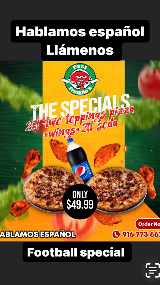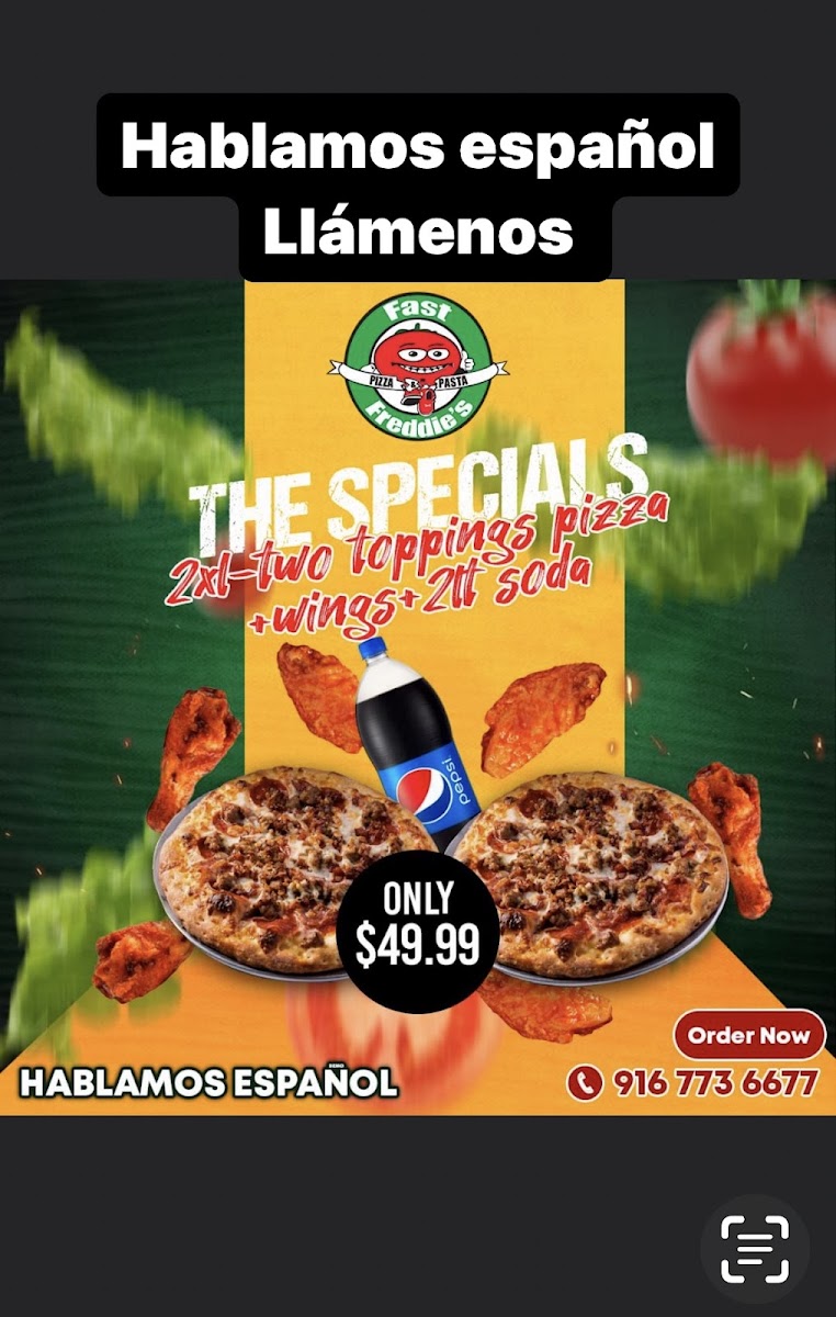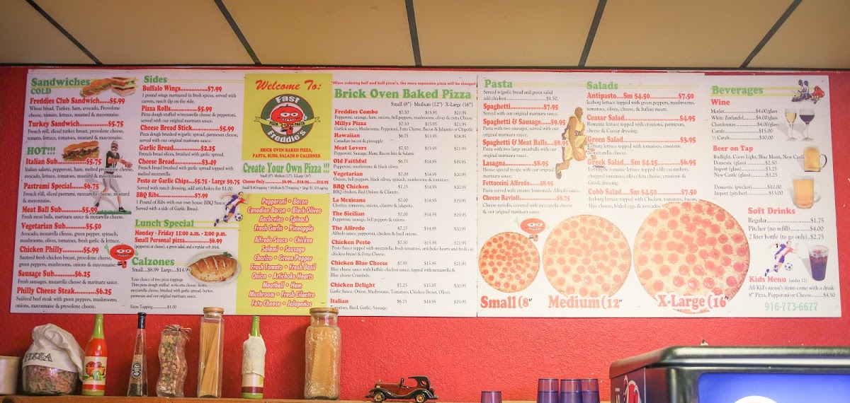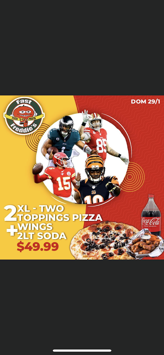 Fast Freddie's Pizza offers a diverse menu catering to various tastes, making it a perfect spot for pizza lovers and more. For those craving a light start, the salads are a solid choice, with options like Antipasto, Caesar Salad, Green Salad, Greek Salad, and Cobb Salad. Moving on to the pizza selection, the Brick Oven Baked Pizza lineup includes delicious choices such as the Freddie Combo, Hawaiian, Meat Lovers, Old Faithful, and Vegetarian pizzas, each bringing its own unique flavors. If you're feeling creative, you can opt for a Create Your Own Pizza, starting with a simple Cheese Only base and adding your preferred toppings. For those looking to complement their meal, the sides menu features tasty options like Buffalo Wings, Pizza Roll, Bread Sticks, Garlic Bread, and Cheese Bread. Whether you're in the mood for a fresh salad or a satisfying pizza, Fast Freddie's has something to suit every craving.